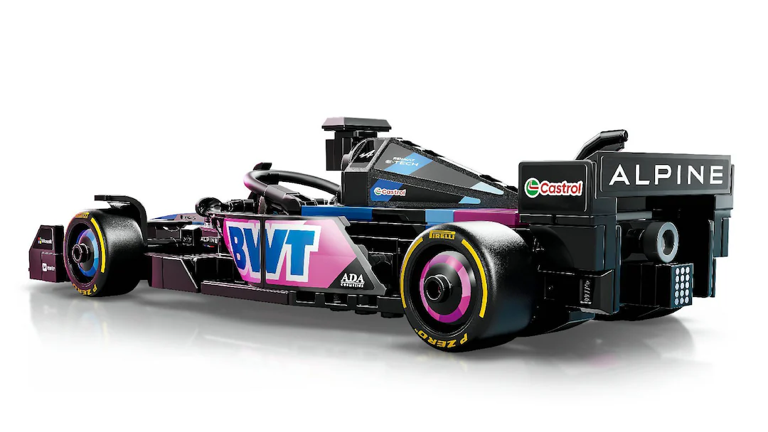 The F1 model car features a cockpit that opens by lifting the halo bar, a rear wing, wishbone suspension, sponsor stickers and wider rear tires imprinted with “Pirelli.” The race car toy also includes a driver minifigure wearing an Alpine outfit and a winged helmet to place inside the cockpit.